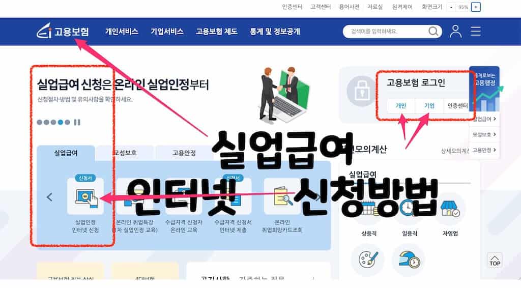 우선 인터넷으로 실업급여(구직급여) 신청하는 것은 고용보험 사이트(ei.go.kr)에 접속하면 아래와 같은 화면이 나타납니다.